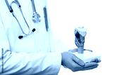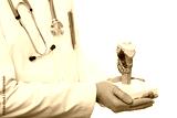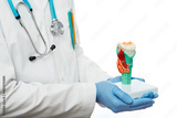 Endocrinologist holds a model thyroid in hands, close-up. Concept diagnostics and treatment of autoimmune thyroid diseases. White background