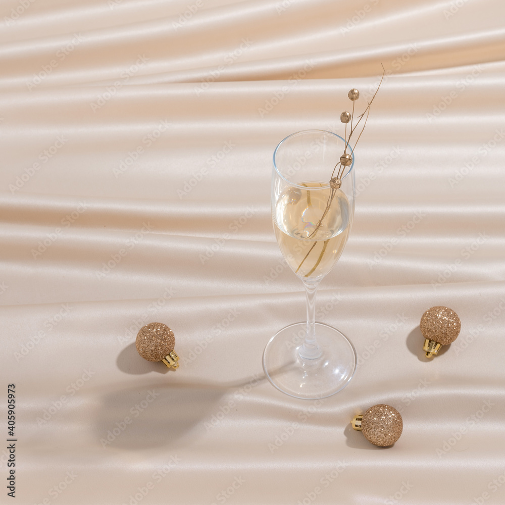 Creative minimal concept made of champaign glass with flax seeds and Christmas baubles on pastel silk sheet