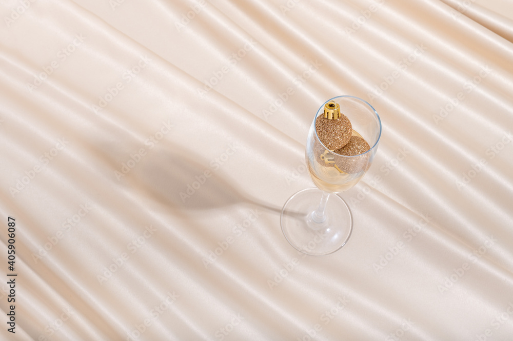 Creative minimal concept made of champaign glass and Christmas baubles on pastel silk sheet