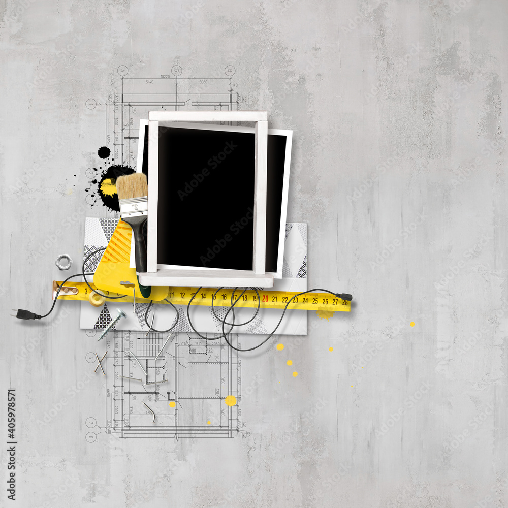 Decorative frame for photo for album on renovation or repair theme. Tools for gluing wallpapers and repair. Cheerful memories about renovation. DIY concept. 'Do it yourself' renovation of own home
