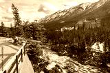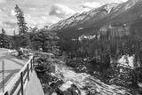 Fairmont Banff Springs and Bow River Falls in snowy autumn sunny day. View from Surprise Corner Viewpoint. Banff National Park, Canadian Rockies.