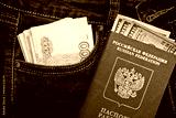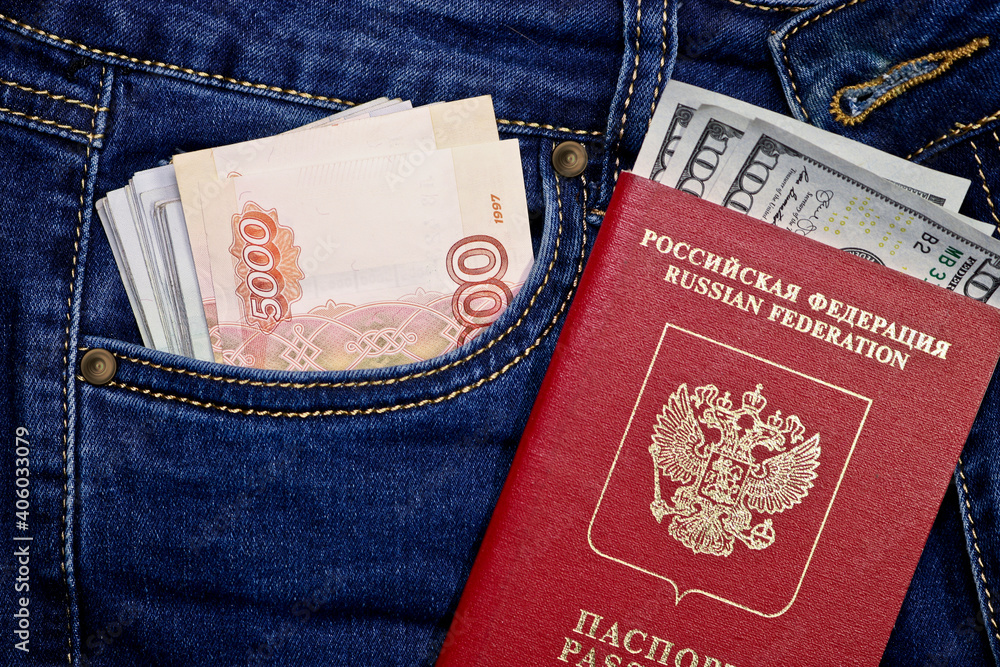 A stack of American hundred dollar bills in the international passport of Russia and Russian rubles in a pocket of blue jeans. Money, cash. Travel concept.