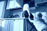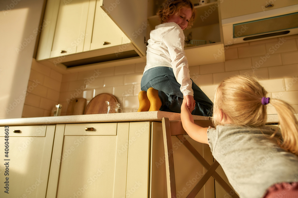 Two naughty kids, brother and sister trying to find something sweet in the kitchen cupboard. Little girl helping her brother by holding his hand