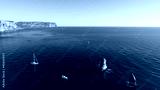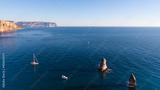 Many ships and boats on the water of Black sea in the Bay of Sevastopol with rocks and mountains