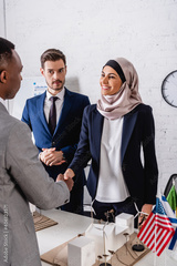 african american businessman shaking hands with happy arabian business partner near maquette of green energy station and international flags