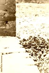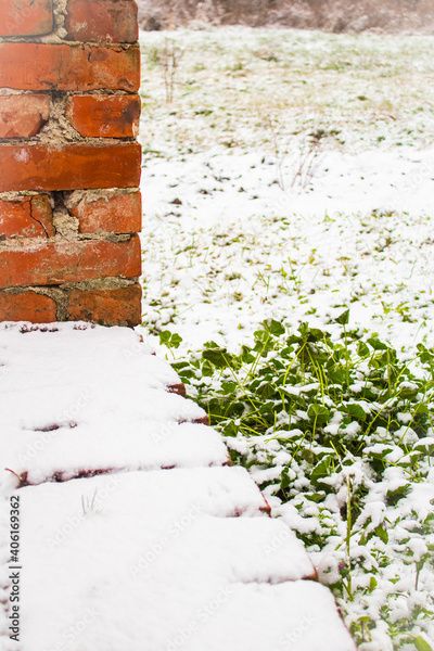 Green grass in the snow near a brick porch in the countryside
