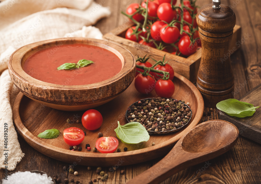 Wooden plate of creamy tomato soup 0n round tray, pepper and kitchen cloth on wooden background with box of raw tomatoes.