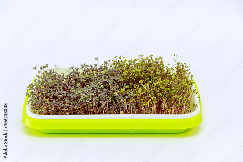 Micro greens in a light green tray on a white background, grown at home in a plastic container.