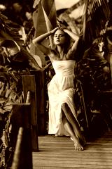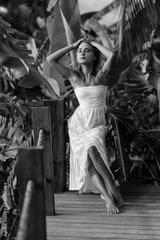 Fashion outdoor portrait of blonde woman, wearing elegant white dress, tropical leaves on background.