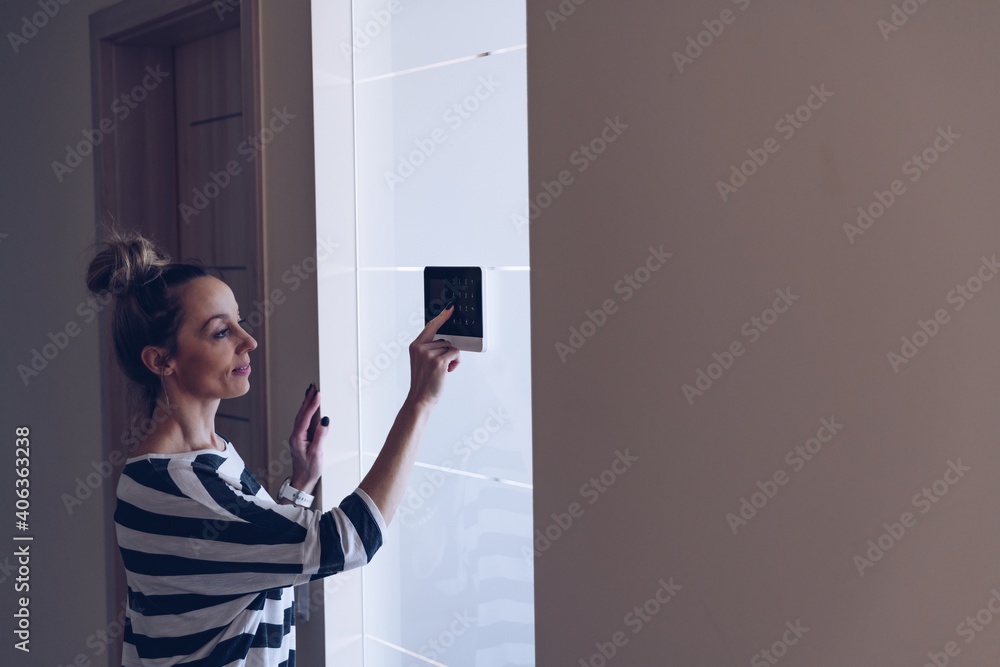 Smiling woman entering code on keypad of home security alarm. Home security.