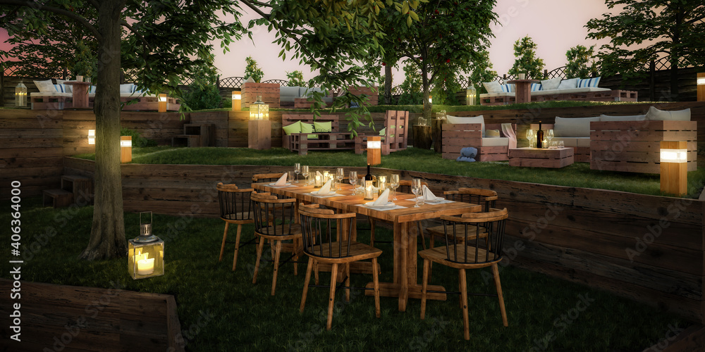 Garden Area of Pub & Restaurant - panoramic 3d visualization