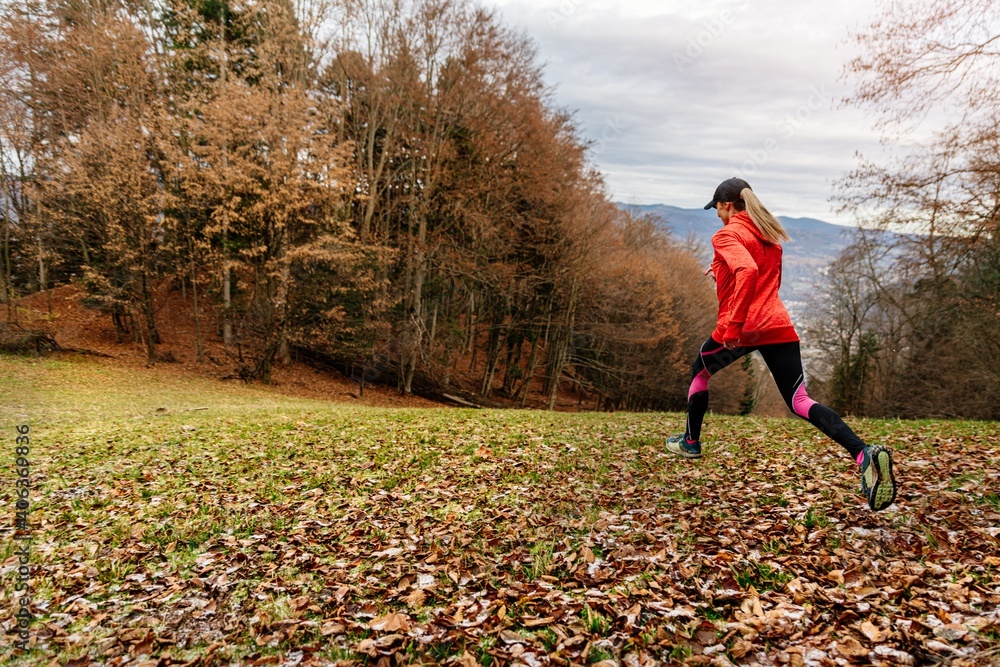 Healthy woman in red sweatshirt running on mountain trail in autumn. Healthy lifestyle.