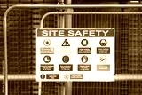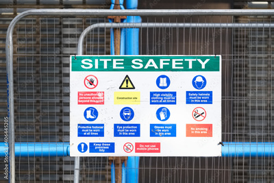 Construction site health and safety message rules sign board signage on fence boundary