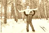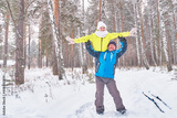 Happy mature couple in winter sportswear having fun over the backdrop of a snowy forest.
