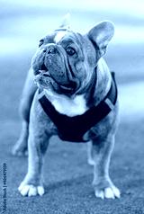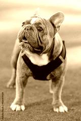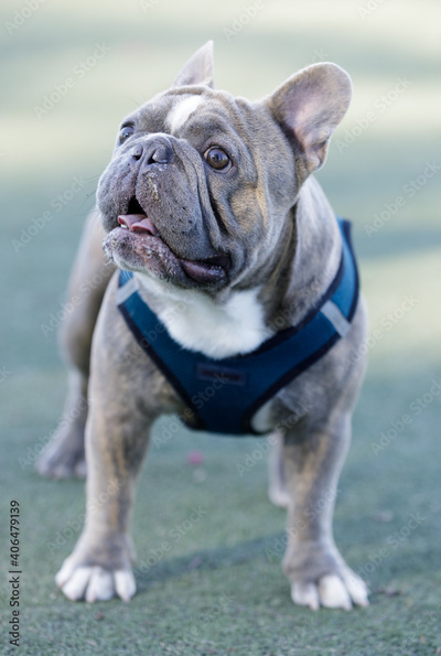Brindle French Bulldog Male Standing and Making a Face. Off-leash dog park in Northern California.