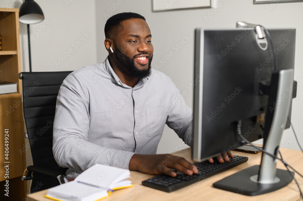 Happy multiracial guy in smart casual shirt is using a PC for work. Young African businessman is typing on keyboard, and looking on computer screen at home office