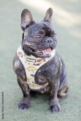 Brindle French Bulldog Male Puppy Sitting with Tongue Out and Looking Away. Off-leash dog park in Northern California.