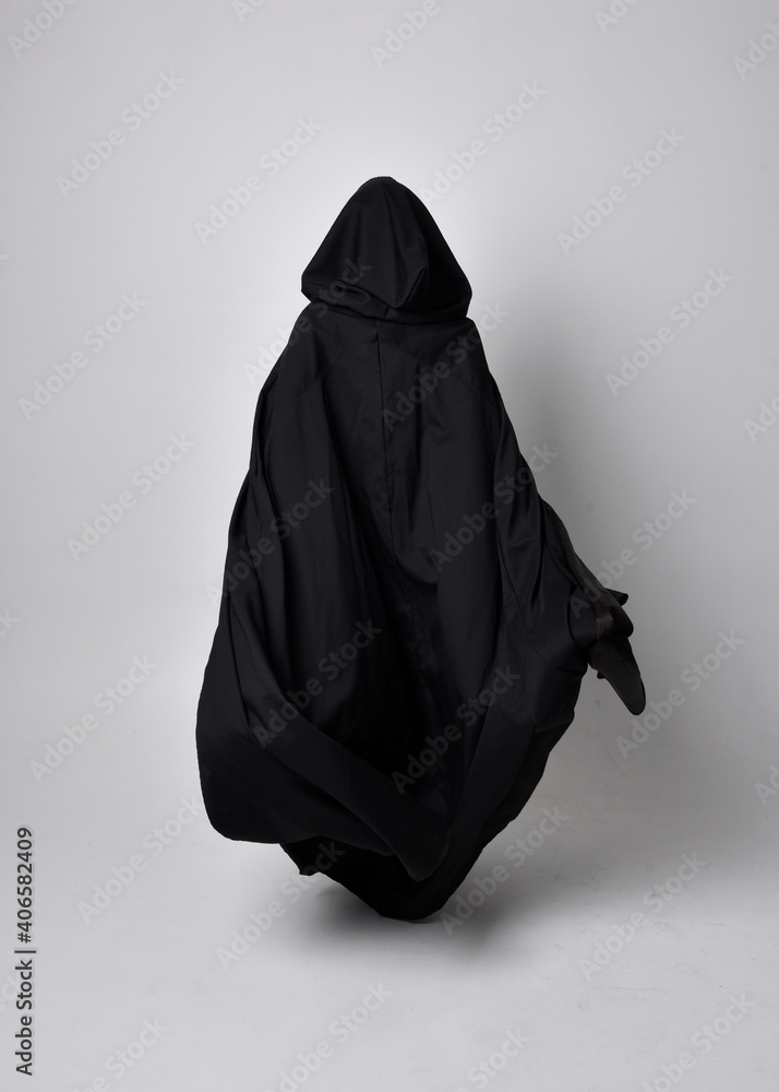 Full length portrait of pretty black haired woman wearing long dark gown nada cloak. Standing pose facing away from the camera, against a studio background.