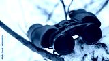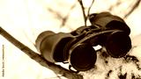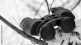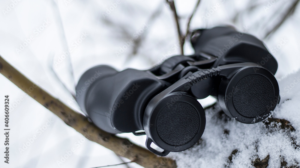 Binoculars in nature, snowy forest. Close-up.