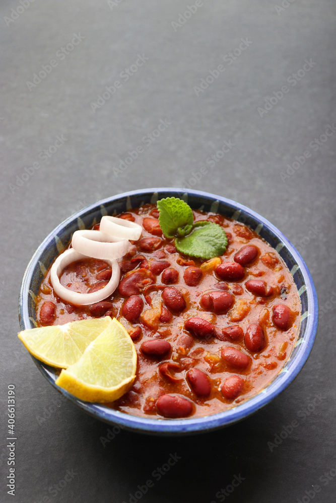 Rajma curry is a popular North Indian Food. Rajma is a socked Red kidney beans cooked with onions, tomatoes and a special blend of spices. Served with Jeera rice or Cumin Rice. With Copy Space.