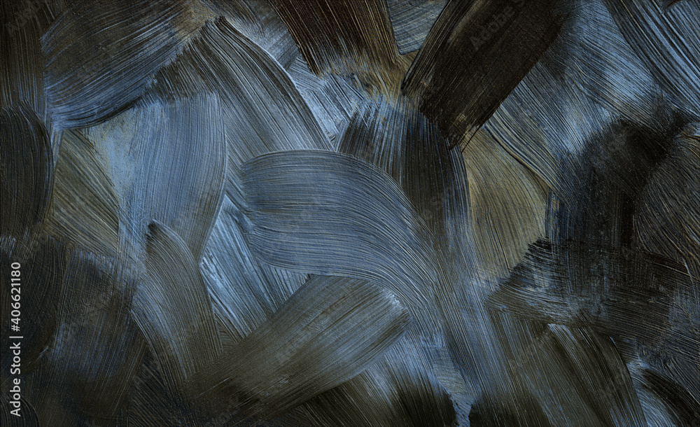 Turquoise and brown art background. Large brush strokes. Acrylic paint in blue, umber and black colors. Abstract painting with dark moody. Textured surface template for banner. Grunge illustration