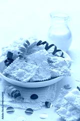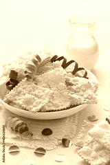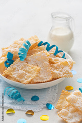 Sfrappole or chiachiere or angel wings are a traditional sweet crisp pastry deep-fried and sprinkled with powdered sugar. Jug of milk. Carnival food tradition. Vertical image.