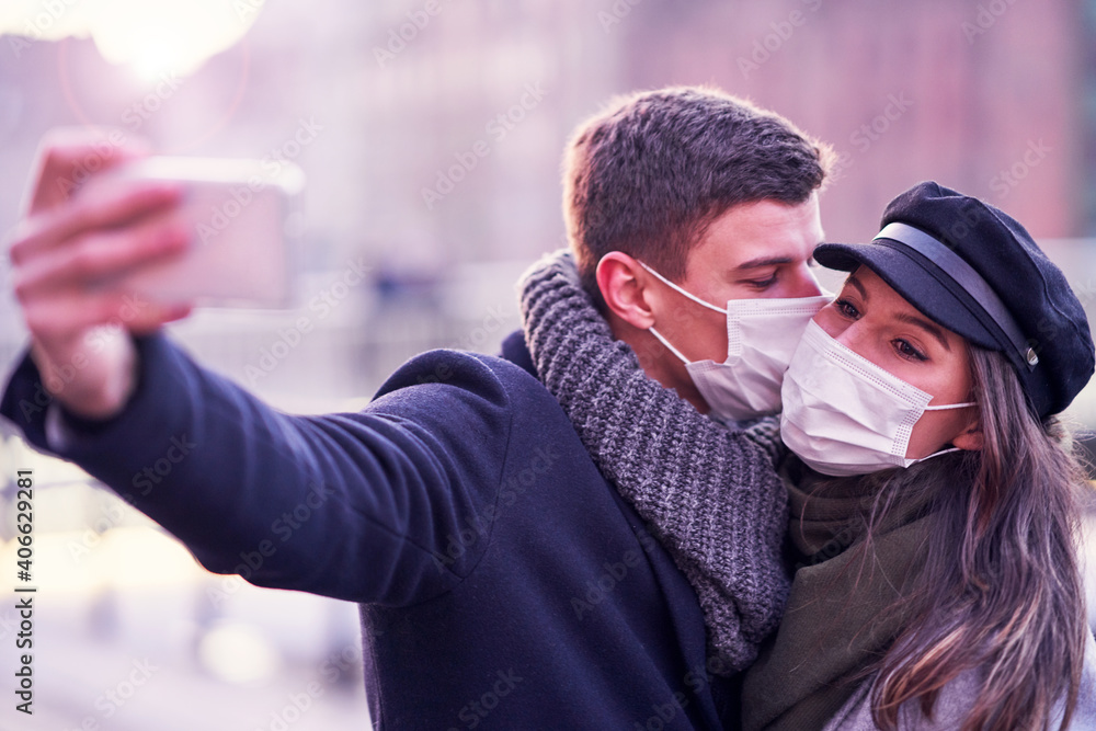 Happy couple celebrating Valentines Day in masks during covid-19 pandemic