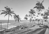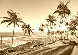 Tropical beach with coconut palm trees at sunset, color toned picture.