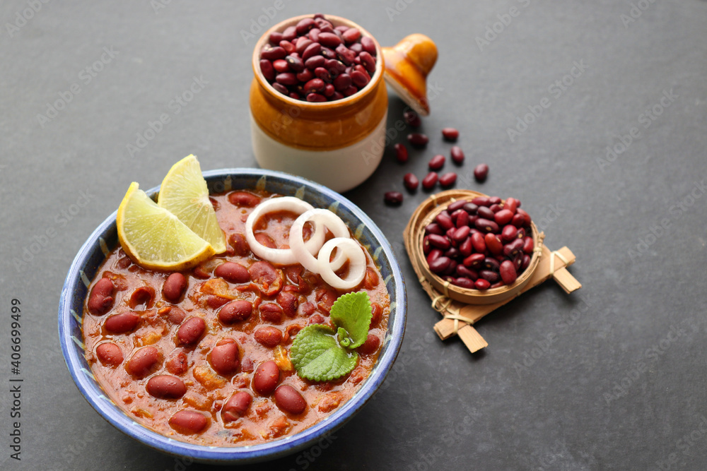 Rajma curry is a popular North Indian Food. Rajma is a socked Red kidney beans cooked with onions, tomatoes and a special blend of spices. Served with Jeera rice or Cumin Rice. With Copy Space.