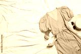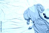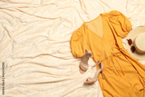 Flat lay composition with stylish yellow dress on beige blanket. Space for text