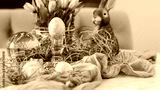 Easter card with colored eggs, gray eggs, marble pattern, spring flowers. Festive Easter background.