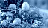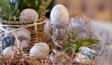 Easter card with colored eggs, gray eggs, marble pattern, spring flowers. Festive Easter background.