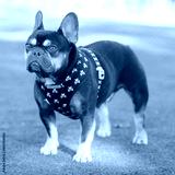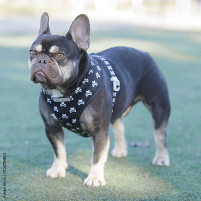 Lilac Brown Frenchie Standing and Looking Away. Off-leash dog park in Northern California.