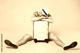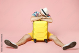 Full length of tired young traveler tourist man in summer clothes hat sit on floor sleeping on suitcase isolated on pink background. Passenger traveling abroad on weekend. Air flight journey concept.