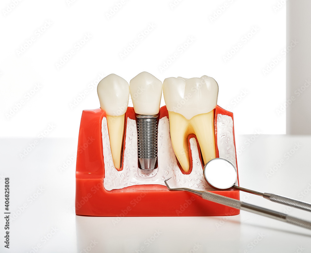 Dental prosthetics, close-up. Mouth mirror near of an anatomical model of jaw
