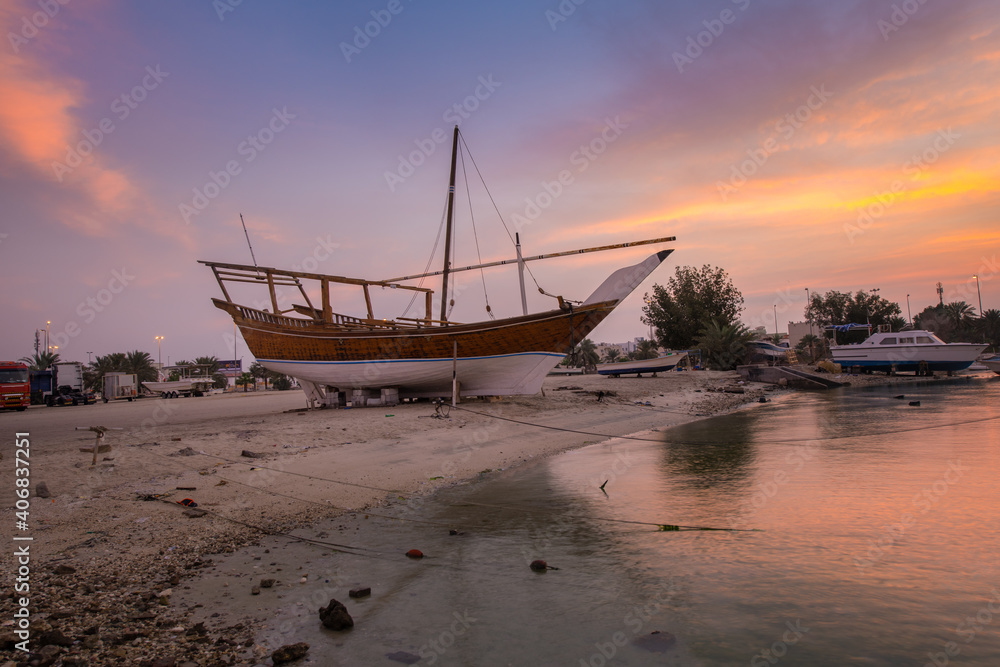 Traditional wooden dhow anchored and beautiful clouds in the background.