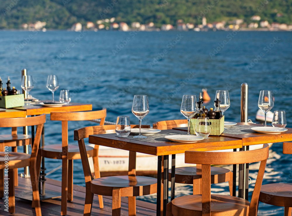 Beautiful restaurant at the sea, afternoon, eating out concept