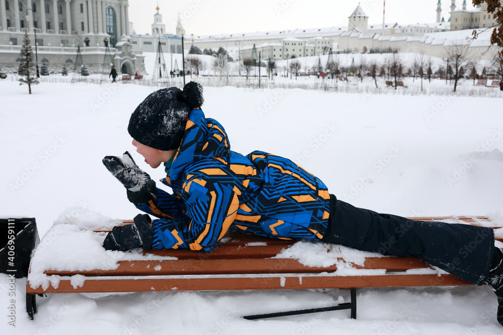 Child lying on snow covered bench