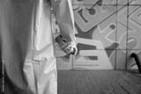 Cropped image of street artist with spray paint can in hand standing near the wall