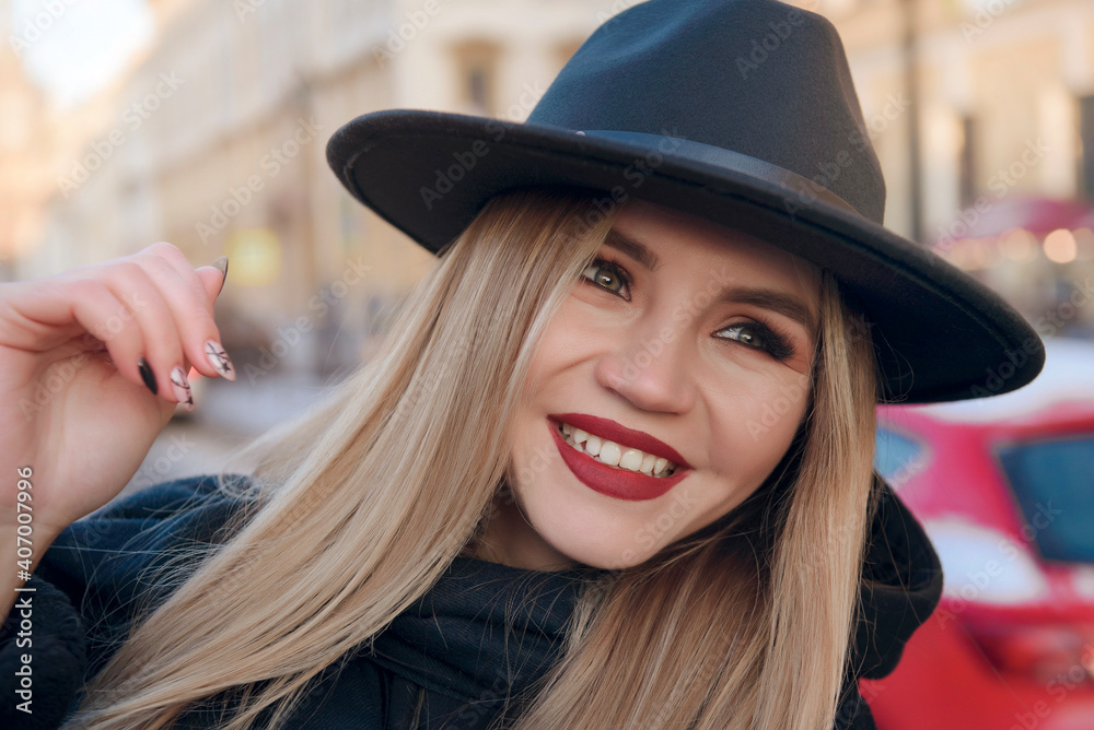 european young blonde woman in black clothes and hat smile close up