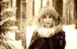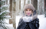 blonde woman in a black jacket and hat and mittens in the forest in winter blowing on the snow on her hands