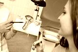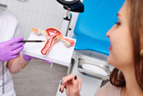 a young attractive girl at a women's consultation with a gynecologist. The gynecologist shows the patient a model of the uterus against the background of a gynecological chair.