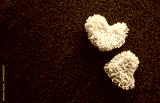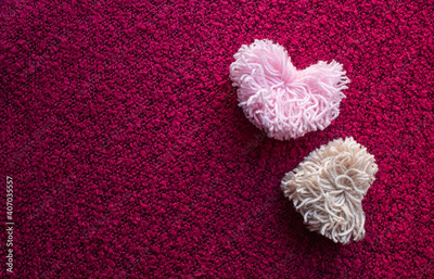 Two fluffy pompoms made of pink and beige heart-shaped ponies on a crimson background