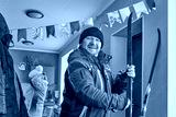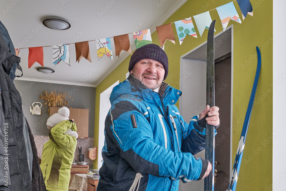 An elderly couple in warm sports clothes is going to go skiing. A man rubs the surface of a ski for sliding and looks at the camera.