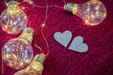 Silver hearts on a crimson background beside lies a garland