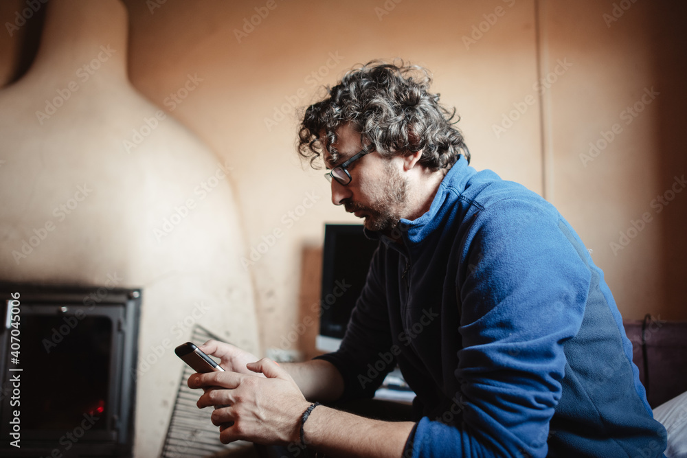 Hombre en casa de campo con chimenea mirando el teléfono móvil inteligente con sudadera azul.