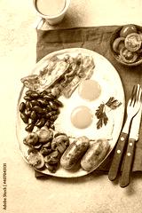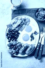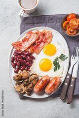English Breakfast with fried eggs, sausages, bacon, beans, toasts, tomatoes and mushrooms on white plate, concrette background, Top view