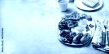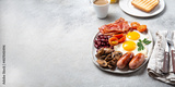 English Breakfast with fried eggs, sausages, bacon, beans, toasts, tomatoes and mushrooms on white plate, concrette background, Top view