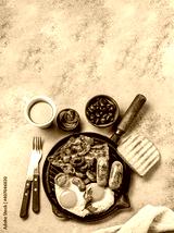 English Breakfast with fried eggs, sausages, bacon, beans, toasts, tomatoes and mushrooms on grill pan, concrette background, Top view