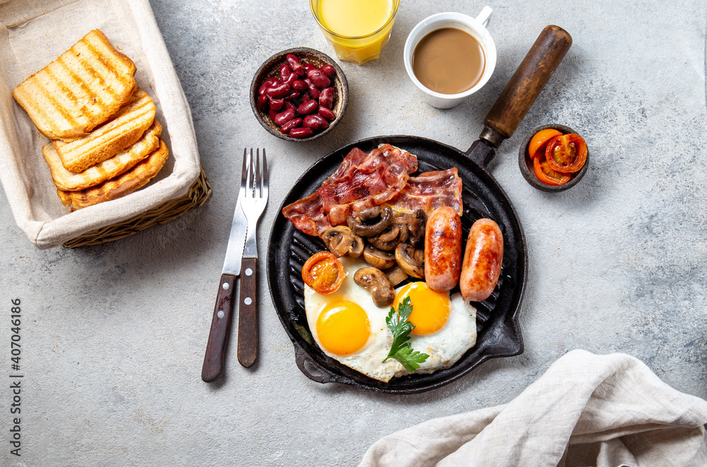 English Breakfast with fried eggs, sausages, bacon, beans, toasts, tomatoes and mushrooms on grill pan, concrette background, Top view